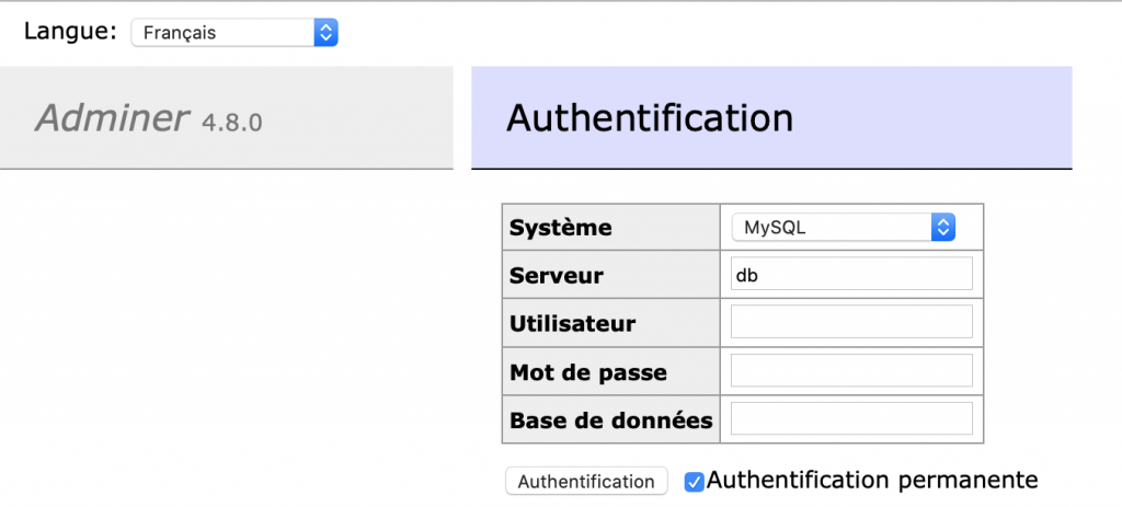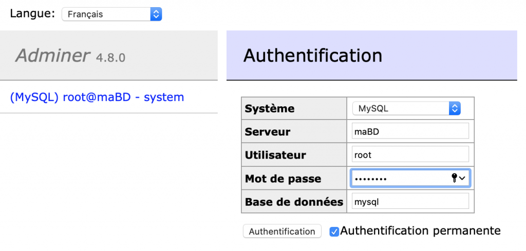 mariadb, Ă©tant donnĂ© quâil utilise le mĂȘme rĂ©seau privĂ© queadmineralors nous pouvons utiliser le nom du conteneur pour la connexion.