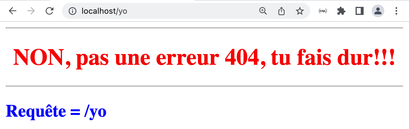 res.write('<html><head><meta charset=\"UTF-8\"></head><body><hr/><center><h1 style="color:red">NON, pas une erreur 404, tu fais dur!!!</h1></center><hr/>');