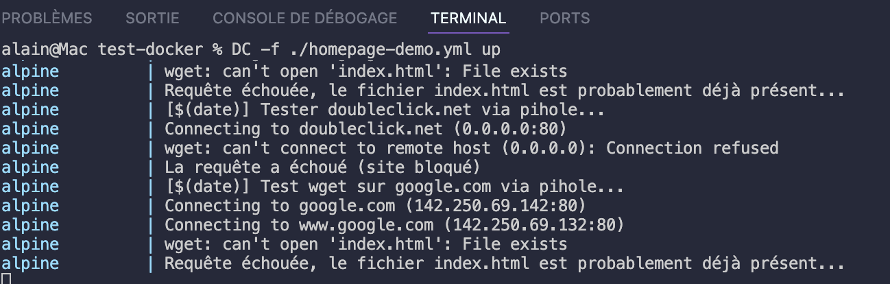 wget doubleclick.net && echo 'La Requête a réussi (étrange - site bloqué!)' || echo '😡 La requête a échoué (site bloqué)';