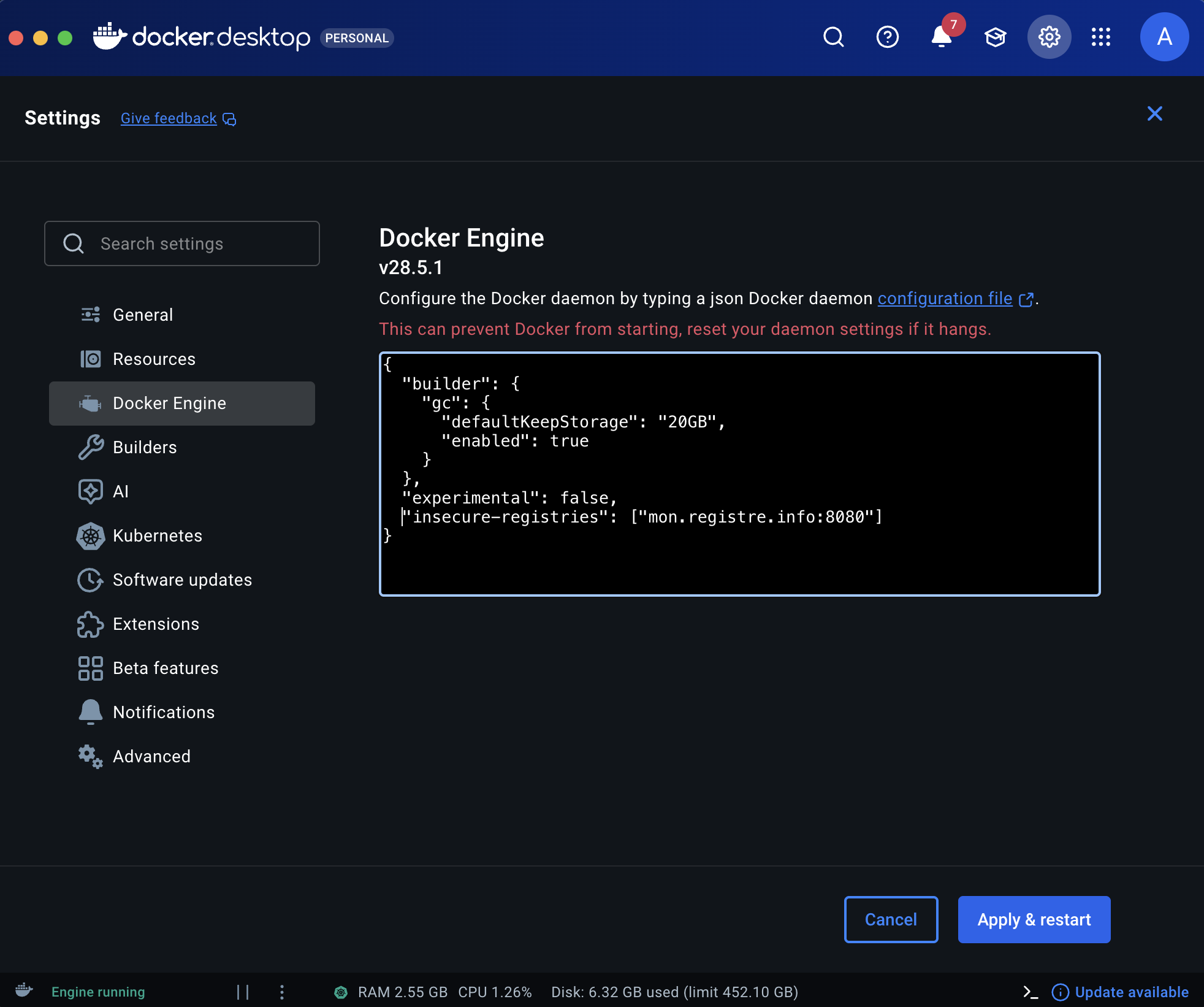 # en ajoutant la paire suivante: "insecure-registries": ["mon.registre.info:8080"]
